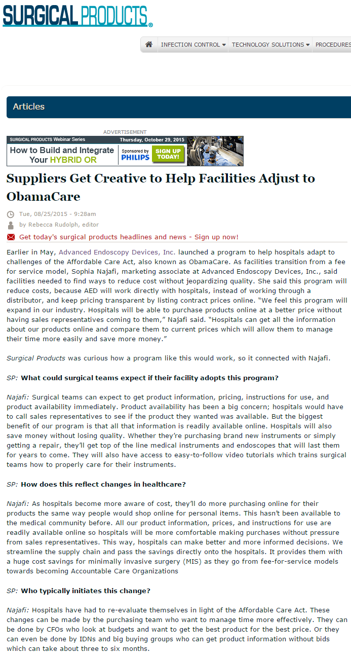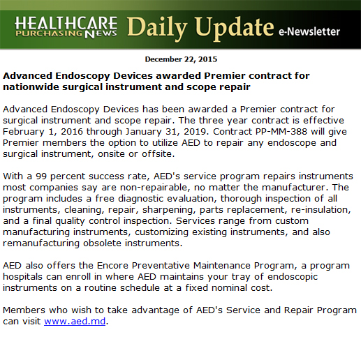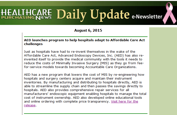 AED introduces EndoPro Cam, the first high performance, point-of-use endoscopic camera system that allows physicians to have a HD visualization system that they can hold in the palm of their hand, use instantly, and carry with them from room to room, office to office with ease.